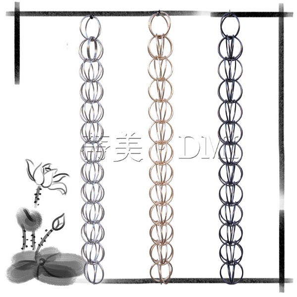 蒂美環(huán)形雨鏈遠(yuǎn)看朦朧婉約,近看精致工巧,雨水順鏈而下,下而伴聲,叮嚀成音,聲色成趣。用手輕輕撥動,能聽到金屬發(fā)出清脆悅耳的碰撞聲。